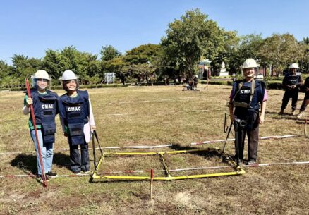 まずは、対人地雷の探知方法についての説明と実践、希望者にはプロテクターやヘルメットを着用しての体験をさせて頂きました。