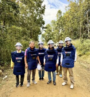 そのエリアCMAA15477のA2-2(1,238,983 ㎡ 約124ha)を視察します。これまでにタイプ69、タイプ72A、PMN2、POMZ2などの対人地雷が発見されていました。ブリーフィングの後、ヘルメットやプロテクターを装着し、2班に別れていよいよ地雷撤去の視察に入りました。